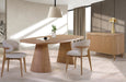 The Halo Dining Chair offers a refined balance of comfort and sculptural form. Crafted from solid oak and oak veneer, it showcases smooth, curved lines that create an inviting silhouette. The rounded backrest wraps gently around the body, providing supportive comfort and a sense of embrace. Upholstered in soft textured fabric, the seat and back deliver both elegance and ease for everyday dining. With its natural oak frame and organic shape, the Halo Chair complements contemporary, Scandinavian, and minimalist interiors.